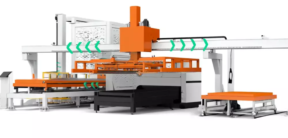 Трёхмерная складская система: оптимизация пространства 6-уровневая стеллажная конструкция обеспечивает компактное и упорядоченное хранение сырья. Рациональное использование площади цеха с увеличенной вместимостью складских ячеек. Интеллектуальное управление перемещением заготовок для обеспечения непрерывного цикла резки.
