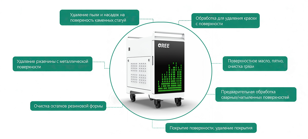 Серия OR-LC-D от завода OREE LASER — это портативное и эффективное решение для современной очистки поверхностей. Аппарат оснащен эргономичной ручной чистящей головкой, которая имеет легкую конструкцию и удобную форму, что позволяет легко использовать ее для различных видов работ. Головка оборудована металлическими датчиками безопасности и системой автоматической блокировки лазера при поднятии, обеспечивая безопасную и простую эксплуатацию. Благодаря бесконтактному принципу работы технология исключает повреждение очищаемой поверхности (подложки), не требует шлифовки и не создает вторичного загрязнения. Профессиональная система очистки поддерживает несколько процессов очистки с настройками в одно касание, что делает работу оборудования более интеллектуальной и адаптивной. Небольшой корпус и простота управления обеспечивают легкую интеграцию в различные рабочие процессы.
