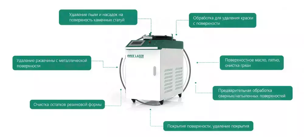 Небольшой корпус, эффективная очистка К его преимуществам относятся простота управления, простота интеграции с автоматизированными системами, отсутствие необходимости в химических реагентах, очистка поверхности, высокая степень очистки, высокая точность, высокая эффективность и экологичность, безопасность и надежность, практически полное отсутствие повреждений поверхности материала, а также возможность решения многих проблем, которые не поддаются традиционной очистке.